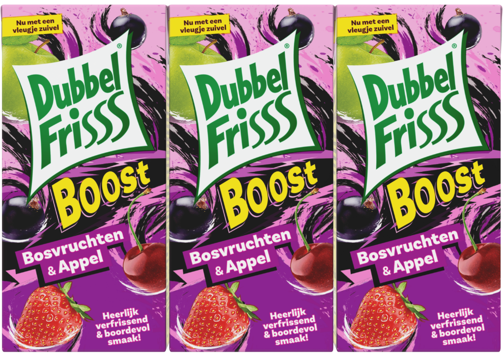 Laat je verrassen door de verfrissende combinatie van bosvruchten en appel! DubbelFrisss boost bosvruchten – appel is een vruchtenfrisdrank met 15% heerlijk vruchtensap en een vleugje zuivel.
